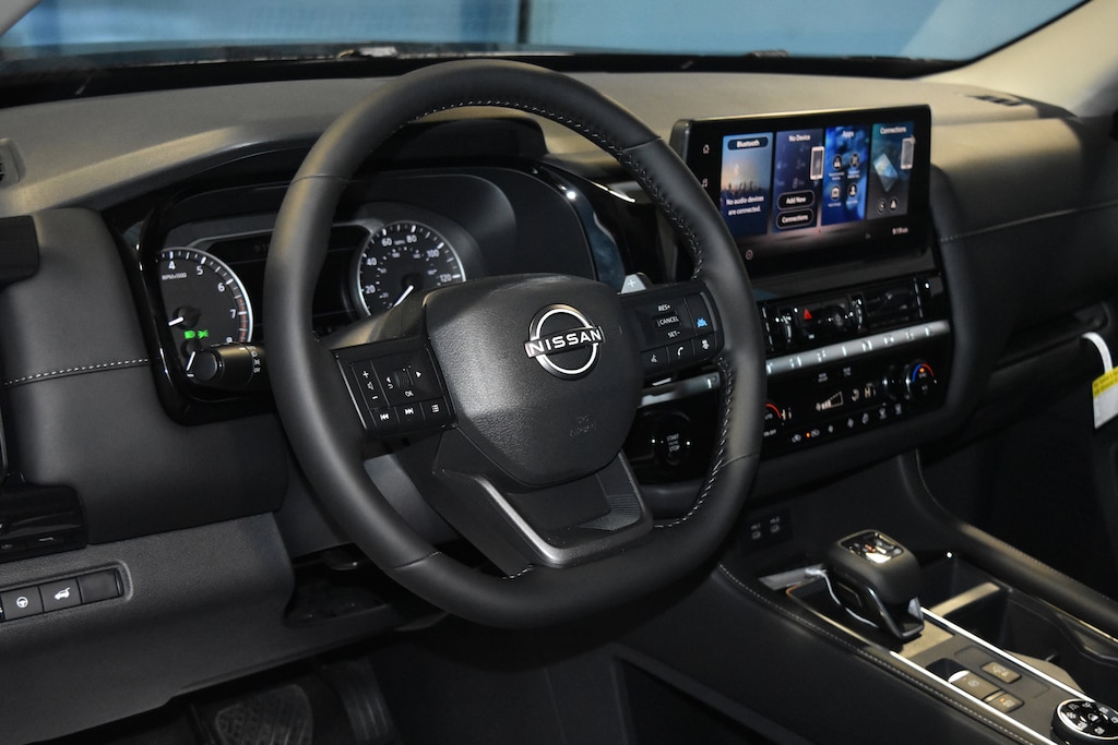 Super Black 2026 Nissan Pathfinder SV 4WD 9-Speed Automatic 3.5L V6 DOHC 4WD, 18 Painted Alloy Wheels, 3rd row seats: bench, 4-Piece Black Splash Guards, 4-Wheel Disc Brakes, 6 Speakers, ABS brakes, Air Conditioning, Alloy wheels, AM/FM radio: SiriusXM w/360L, Auto High-beam Headlights, Automatic temperature control, Bench Seat Carpeted Floor Mats, Brake assist, Bumpers: body-color, Cloth Seating Surfaces, Cross Bars, Delay-off headlights, Driver door bin, Driver vanity mirror, Dual front impact airbags, Dual front side impact airbags, Electronic Stability Control, Emergency communication system: NissanConnect Services, Four wheel independent suspension, Front anti-roll bar, Front Bucket Seats, Front Center Armrest, Front dual zone A/C, Front reading lights, Fully automatic headlights, Garage door transmitter: myQ Connected Garage, Heated door mirrors, Heated Front Bucket Seats, Heated front seats, Illuminated entry, Knee airbag, Low tire pressure warning, NissanConnect featuring Apple CarPlay and Android Auto, Occupant sensing airbag, Outside temperature display, Overhead airbag, Overhead console, Panic alarm, Passenger door bin, Passenger vanity mirror, Power door mirrors, Power driver seat, Power Liftgate, Power steering, Power windows, Radio data system, Radio: AM/FM Audio System with NissanConnect, Rear air conditioning, Rear anti-roll bar, Rear reading lights, Rear seat center armrest, Rear side impact airbag, Rear window defroster, Rear window wiper, Reclining 3rd row seat, Remote keyless entry, Security system, Speed control, Speed-sensing steering, Split folding rear seat, Spoiler, Steering wheel mounted audio controls, Tachometer, Telescoping steering wheel, Tilt steering wheel, Traction control, Trip computer, Variably intermittent wipers, 4WD.