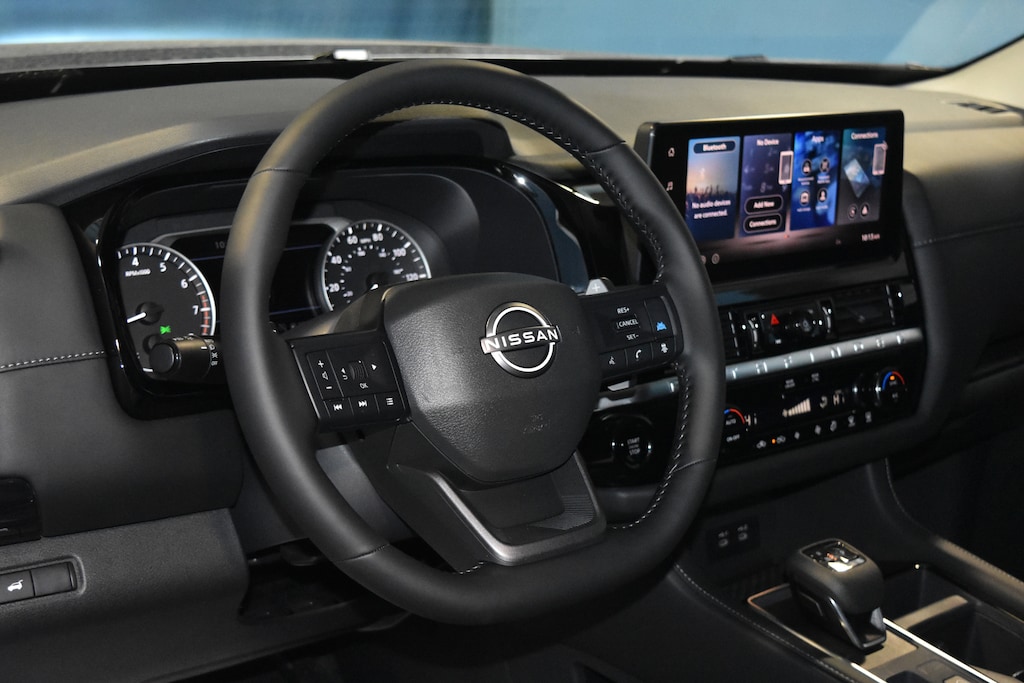 Gun Metallic 2026 Nissan Pathfinder SV 4WD 9-Speed Automatic 3.5L V6 DOHC 4WD, 18 Painted Alloy Wheels, 3rd row seats: bench, 4-Piece Black Splash Guards, 4-Wheel Disc Brakes, 6 Speakers, ABS brakes, Air Conditioning, Alloy wheels, AM/FM radio: SiriusXM w/360L, Auto High-beam Headlights, Automatic temperature control, Bench Seat Carpeted Floor Mats, Brake assist, Bumpers: body-color, Cloth Seating Surfaces, Cross Bars, Delay-off headlights, Driver door bin, Driver vanity mirror, Dual front impact airbags, Dual front side impact airbags, Electronic Stability Control, Emergency communication system: NissanConnect Services, Four wheel independent suspension, Front anti-roll bar, Front Bucket Seats, Front Center Armrest, Front dual zone A/C, Front reading lights, Fully automatic headlights, Garage door transmitter: myQ Connected Garage, Heated door mirrors, Heated Front Bucket Seats, Heated front seats, Illuminated entry, Knee airbag, Low tire pressure warning, NissanConnect featuring Apple CarPlay and Android Auto, Occupant sensing airbag, Outside temperature display, Overhead airbag, Overhead console, Panic alarm, Passenger door bin, Passenger vanity mirror, Power door mirrors, Power driver seat, Power Liftgate, Power steering, Power windows, Radio data system, Radio: AM/FM Audio System with NissanConnect, Rear air conditioning, Rear anti-roll bar, Rear reading lights, Rear seat center armrest, Rear side impact airbag, Rear window defroster, Rear window wiper, Reclining 3rd row seat, Remote keyless entry, Security system, Speed control, Speed-sensing steering, Split folding rear seat, Spoiler, Steering wheel mounted audio controls, Tachometer, Telescoping steering wheel, Tilt steering wheel, Traction control, Trip computer, Variably intermittent wipers, 4WD.