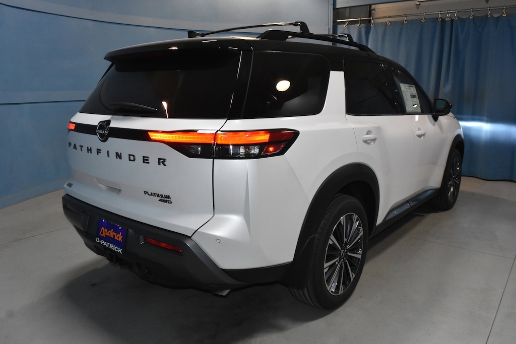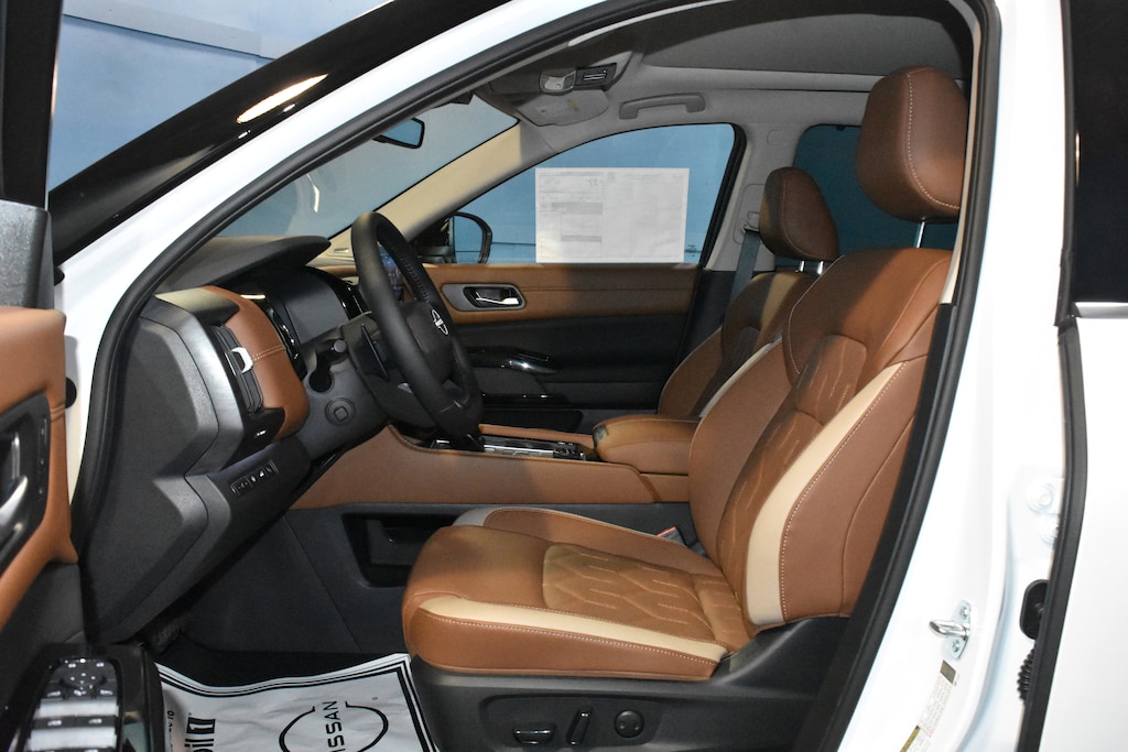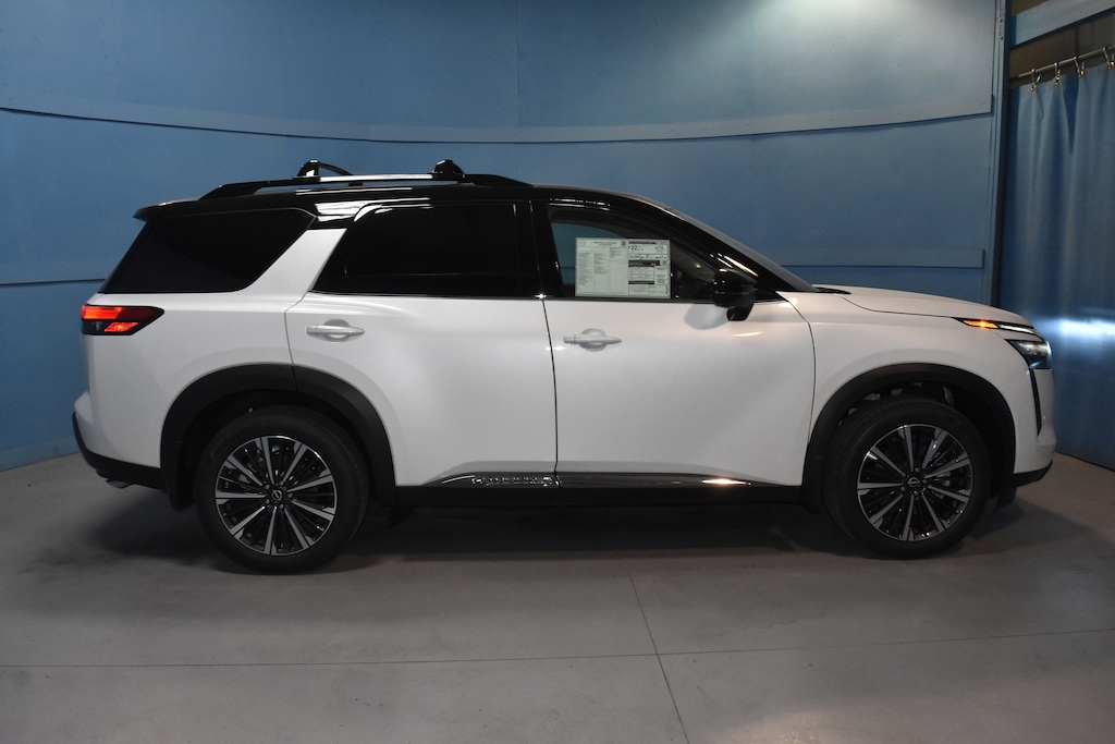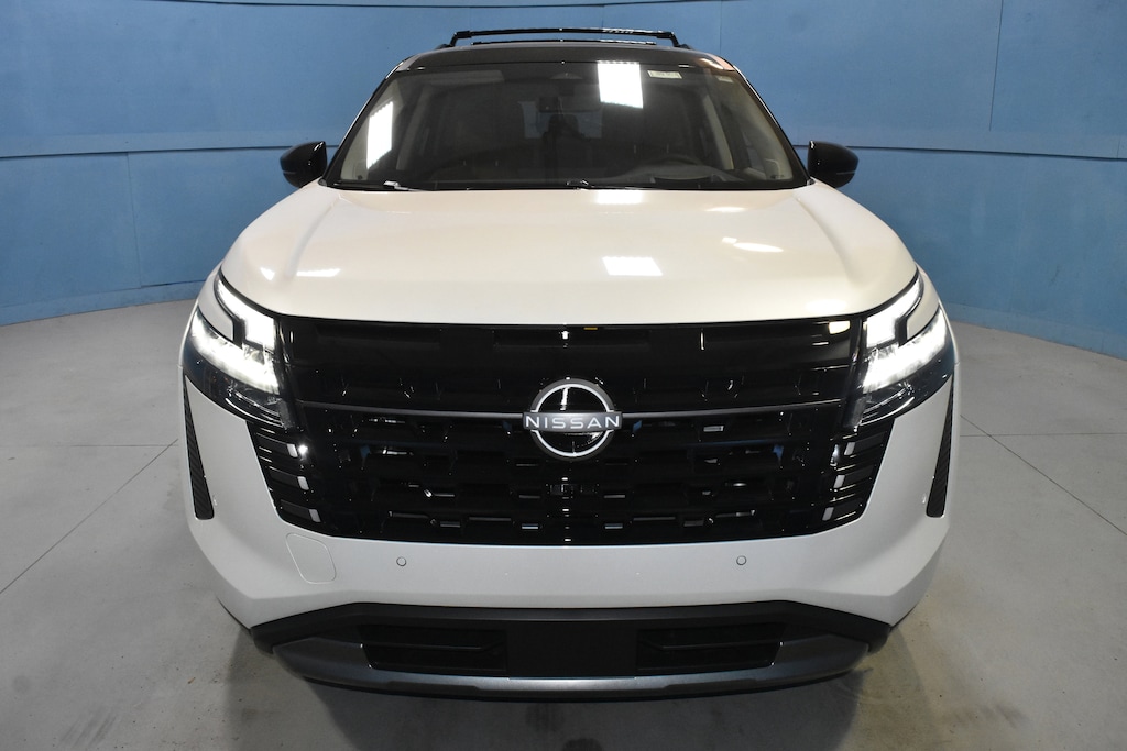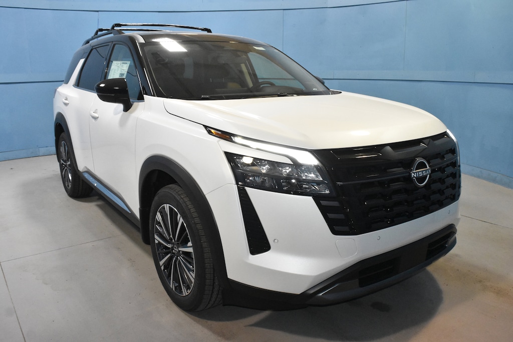 Everest White Pearl/Black 2026 Nissan Pathfinder Platinum 4WD 9-Speed Automatic 3.5L V6 DOHC 4WD, 13 Speakers, 3rd row seats: bench, 4-Piece Black Splash Guards, 4-Wheel Disc Brakes, ABS brakes, Air Conditioning, Alloy wheels, AM/FM radio: SiriusXM w/360L, Auto High-beam Headlights, Auto tilt-away steering wheel, Auto-dimming Rear-View mirror, Automatic temperature control, Bench Seat Carpeted Floor Mats, Bodyside moldings, Bose Premium Audio System, Brake assist, Bumpers: body-color, Cargo Area Protector, Cargo Net, Cargo Package, Climate Controlled Front Bucket Seats, Cross Bars, Delay-off headlights, Driver door bin, Driver vanity mirror, Dual front impact airbags, Dual front side impact airbags, Electronic Stability Control, Emergency communication system: NissanConnect Services, First Aid, Four wheel independent suspension, Front anti-roll bar, Front Bucket Seats, Front Center Armrest, Front dual zone A/C, Front reading lights, Fully automatic headlights, Garage door transmitter: HomeLink, Heads-Up Display, Heated door mirrors, Heated front seats, Heated rear seats, Heated steering wheel, Illuminated entry, Knee airbag, Low tire pressure warning, Memory seat, NissanConnect featuring Apple CarPlay and Android Auto, Occupant sensing airbag, Outside temperature display, Overhead airbag, Overhead console, Panic alarm, Passenger door bin, Passenger vanity mirror, Power door mirrors, Power driver seat, Power Liftgate, Power moonroof, Power passenger seat, Power steering, Power windows, Radio data system, Radio: AM/FM Audio System with NissanConnect, Rain sensing wipers, Rear air conditioning, Rear anti-roll bar, Rear reading lights, Rear seat center armrest, Rear side impact airbag, Rear window defroster, Rear window wiper, Reclining 3rd row seat, Remote keyless entry, Security system, Semi-Aniline Leather-Appointed Seating Surfaces, Speed control, Speed-sensing steering, Speed-Sensitive Wipers, Split folding rear seat, Spoiler, Steering wheel memory, Steering wheel mounted audio controls, Tachometer, Telescoping steering wheel, Tilt steering wheel, Traction control, Trip computer, Turn signal indicator mirrors, Variably intermittent wipers, Ventilated front seats, Wheels: 20 Machined Alloy, 4WD.