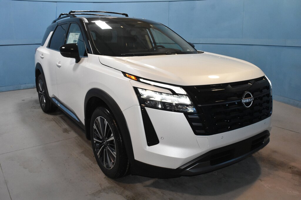 Everest White Pearl/Black 2026 Nissan Pathfinder Platinum 4WD 9-Speed Automatic 3.5L V6 DOHC 4WD, 13 Speakers, 3rd row seats: bench, 4-Piece Black Splash Guards, 4-Wheel Disc Brakes, ABS brakes, Air Conditioning, Alloy wheels, AM/FM radio: SiriusXM w/360L, Auto High-beam Headlights, Auto tilt-away steering wheel, Auto-dimming Rear-View mirror, Automatic temperature control, Bench Seat Carpeted Floor Mats, Bodyside moldings, Bose Premium Audio System, Brake assist, Bumpers: body-color, Cargo Area Protector, Cargo Net, Cargo Package, Climate Controlled Front Bucket Seats, Cross Bars, Delay-off headlights, Driver door bin, Driver vanity mirror, Dual front impact airbags, Dual front side impact airbags, Electronic Stability Control, Emergency communication system: NissanConnect Services, First Aid, Four wheel independent suspension, Front anti-roll bar, Front Bucket Seats, Front Center Armrest, Front dual zone A/C, Front reading lights, Fully automatic headlights, Garage door transmitter: HomeLink, Heads-Up Display, Heated door mirrors, Heated front seats, Heated rear seats, Heated steering wheel, Illuminated entry, Knee airbag, Low tire pressure warning, Memory seat, NissanConnect featuring Apple CarPlay and Android Auto, Occupant sensing airbag, Outside temperature display, Overhead airbag, Overhead console, Panic alarm, Passenger door bin, Passenger vanity mirror, Power door mirrors, Power driver seat, Power Liftgate, Power moonroof, Power passenger seat, Power steering, Power windows, Radio data system, Radio: AM/FM Audio System with NissanConnect, Rain sensing wipers, Rear air conditioning, Rear anti-roll bar, Rear reading lights, Rear seat center armrest, Rear side impact airbag, Rear window defroster, Rear window wiper, Reclining 3rd row seat, Remote keyless entry, Security system, Semi-Aniline Leather-Appointed Seating Surfaces, Speed control, Speed-sensing steering, Speed-Sensitive Wipers, Split folding rear seat, Spoiler, Steering wheel memory, Steering wheel mounted audio controls, Tachometer, Telescoping steering wheel, Tilt steering wheel, Traction control, Trip computer, Turn signal indicator mirrors, Variably intermittent wipers, Ventilated front seats, Wheels: 20 Machined Alloy, 4WD.
