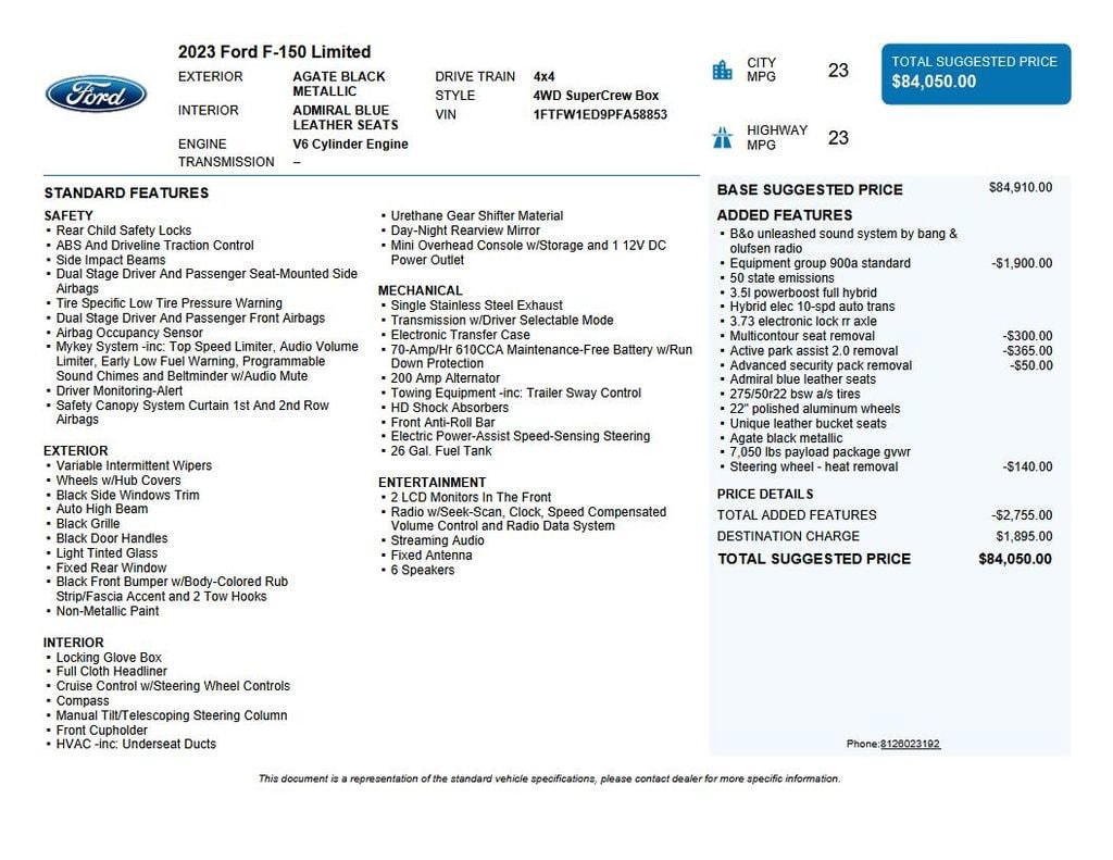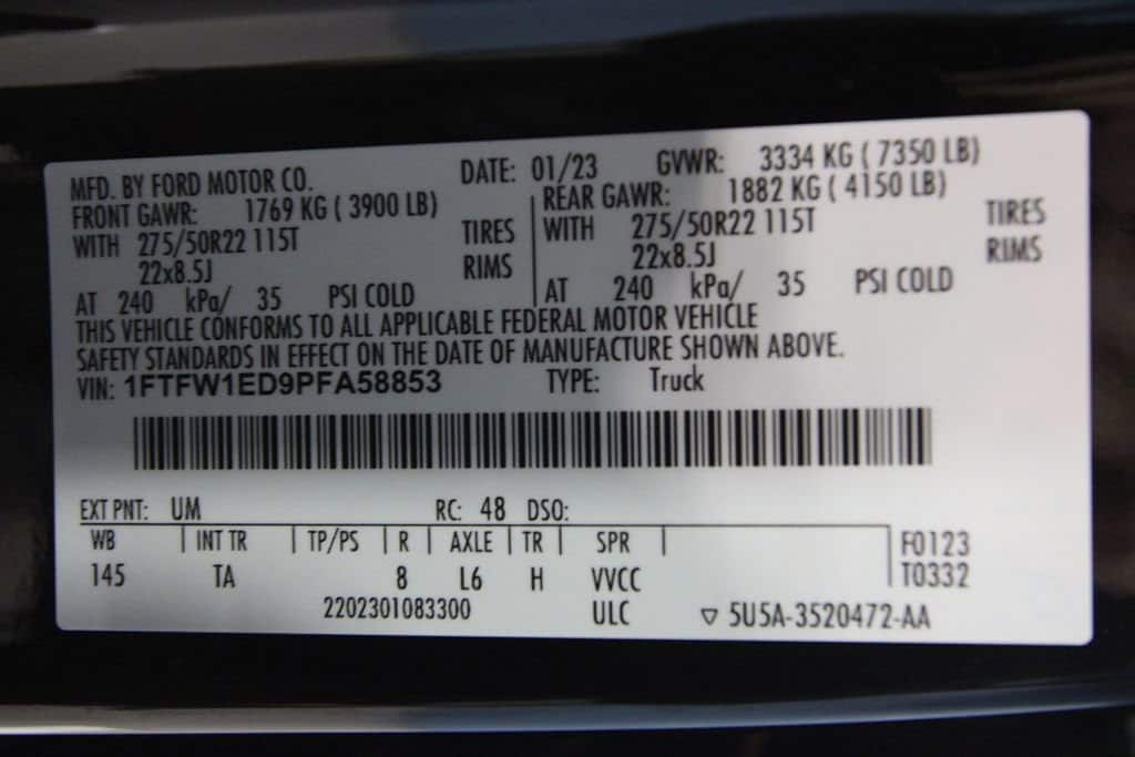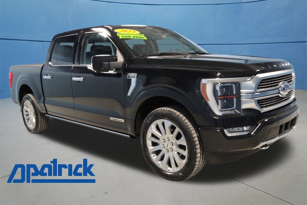 2023 Ford F-150 Limited Recent Arrival! We want you to shop confidently for your next used car at D-Patrick Lebanon Ford and We make it EASY! Buy this used vehicle 100% online or in-store, EASY. Saving time at the dealership, EASY! Financing, EASY! Finding the car you love at the price you want, EASY! This pre-owned vehicle was put through an extensive inspection before hitting our lot. Because of this, we are able to offer a 3-month/3,000-mile comprehensive limited warranty. You also get our Love It or Return It 5-day, 300-mile Exchange Policy. See our website for more details on both. We also offer extended service plans, vehicle protection plans, and CarFax vehicle history report. *Prices listed do not include a $250 documentation fee, applicable tax, title, tags, license, or $195 service and preparation. All pricing, vehicle information, and features (such as accessories and color) are believed to be accurate, but we do not warrant or guarantee such accuracy. The prices shown above may vary from region to region, and incentives are subject to change. Some offers listed may not be available to all customers. All online sale commitments are subject to confirmation of continued availability of vehicle. Once availability is confirmed, online sale agreement becomes binding upon the parties. If any information found on the website is thought to be erroneous, please verify information with a customer service representative. See dealer for full details. Looking to sell your current vehicle? We buy cars for cash. 3.5L PowerBoost Full-Hybrid V6, 4WD, 18 Speakers, 22" Polished Aluminum Wheels, 4-Wheel Disc Brakes, ABS brakes, Active Park Assist 2.0 Removal, Adaptive suspension, Adjustable pedals, Air Conditioning, Alloy wheels, AM/FM radio: SiriusXM with 360L, Auto High-beam Headlights, Auto tilt-away steering wheel, Auto-dimming door mirrors, Auto-dimming Rear-View mirror, Automatic temperature control, Brake assist, Bumpers: body-color, Compass, Delay-off headlights, Driver door bin, Driver vanity mirror, Dual front impact airbags, Dual front side impact airbags, Electronic Locking w/3.73 Axle Ratio, Electronic Stability Control, Emergency communication system: SYNC 4 911 Assist, Equipment Group 900A Standard, Exterior Parking Camera Rear, Front anti-roll bar, Front Bucket Seats, Front Center Armrest, Front dual zone A/C, Front fog lights, Front reading lights, Front wheel independent suspension, Fully automatic headlights, Garage door transmitter, GVWR: 7,050 lbs Payload Package, Heated door mirrors, Heated front seats, Heated rear seats, Heated steering wheel, Illuminated entry, Inclination/Intrusion Sensor Removal, Low tire pressure warning, Memory seat, Multicontour Seats w/Active Motion Removal, Navigation system: Connected Navigation, Occupant sensing airbag, Outside temperature display, Overhead airbag, Overhead console, Panic alarm, Passenger door bin, Passenger vanity mirror, Pedal memory, Power door mirrors, Power driver seat, Power moonroof, Power passenger seat, Power steering, Power windows, Radio data system, Radio: B&O Unleashed Sound System by Bang & Olufsen, Rain sensing wipers, Rear reading lights, Rear seat center armrest, Rear step bumper, Rear window defroster, Remote keyless entry, Security system, Speed control, Speed-sensing steering, Split folding rear seat, Steering Wheel Heat Removal (DISC), Steering wheel memory, Steering wheel mounted audio controls, Tachometer, Telescoping steering wheel, Tilt steering wheel, Traction control, Trip computer, Turn signal indicator mirrors, Unique Leather Bucket Seats, Variably intermittent wipers, Ventilated front seats, Voltmeter, 3.5L PowerBoost Full-Hybrid V6, 4WD. CARFAX One-Owner. 4D SuperCrew Limited 10-Speed Automatic 3.5L PowerBoost Full-Hybrid V6 4WD Black Metallic CALL US TODAY BEFORE THIS ONE GETS AWAY-- (765) 204-6248 or shop online at www.dpatricklebanonford.com.