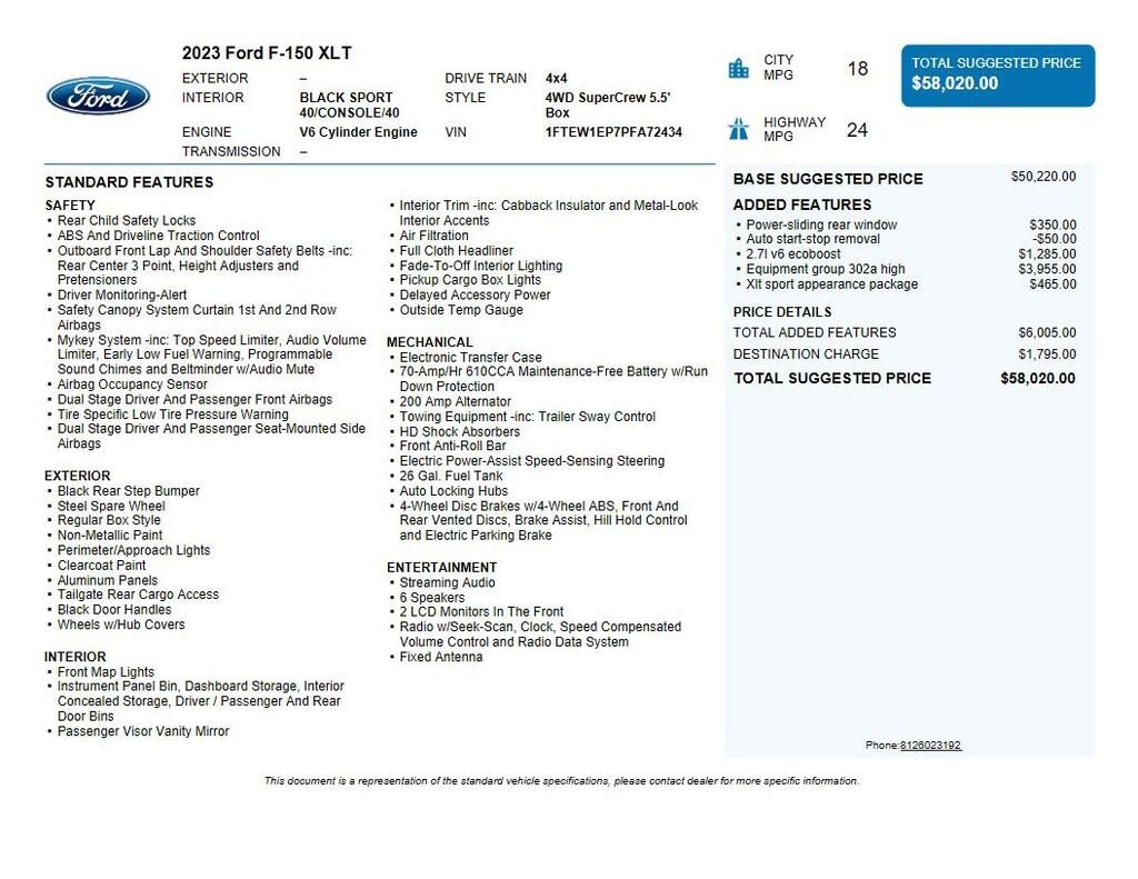 2023 Ford F-150 XLT We want you to shop confidently for your next used car at The BIG Ford Store, D-Patrick Ford. We are located on Highway 41 and Walnut in Evansville, right next to the Lloyd Expressway. Buy this used vehicle 100% online or in-store. This pre-owned vehicle was put through an extensive inspection before hitting our lot. Because of this, we are able to offer a 3-month/3,000-mile comprehensive limited warranty. You also get our Love It or Return It 5-day, 300-mile Exchange Policy. See our website for more details on both. We also offer extended service plans, vehicle protection plans, and offer a CarFax vehicle history report. *Prices listed do not include a $250 documentation fee, applicable tax, title, tags, license, or $195 service and preparation. All pricing, vehicle information, and features (such as accessories and color) are believed to be accurate, but we do not warrant or guarantee such accuracy. The prices shown above may vary from region to region, and incentives are subject to change. Some offers listed may not be available to all customers. All online sale commitments are subject to confirmation of continued availability of vehicle. Once availability is confirmed, online sale agreement becomes binding upon the parties. If any information found on the website is thought to be erroneous, please verify information with a customer service representative. See dealer for full details. Looking to sell your current vehicle? We buy cars for cash. Every test drive at D-Patrick Ford in Evansville earns $10 to a local charity. Schedule your test drive today! 4WD, 3.55 Axle Ratio, 3.73 Axle Ratio, 4-Wheel Disc Brakes, 6 Speakers, ABS brakes, Accent-Color Step Bars, Air Conditioning, Alloy wheels, AM/FM radio, Auto High-beam Headlights, Auto-Dimming Rear-View Mirror, Black 2-Bar Style Grille w/Black Surround/Accents, Body-Color Door & Tailgate Handles, Box Side Decals, Brake assist, Bumpers: chrome, Class IV Trailer Hitch Receiver, Cloth 40/20/40 Front Seat, Compass, Delay-off headlights, Driver door bin, Driver vanity mirror, Dual front impact airbags, Dual front side impact airbags, Electronic Stability Control, Emergency communication system: SYNC 4 911 Assist, Equipment Group 302A High, Exterior Parking Camera Rear, Front anti-roll bar, Front Center Armrest w/Storage, Front fog lights, Front reading lights, Front wheel independent suspension, Fully automatic headlights, GVWR: 6,470 lbs Payload Package, Heated door mirrors, Illuminated entry, LED Reflector Headlamps, LED Sideview Mirror Spotlights, Low tire pressure warning, Occupant sensing airbag, Onboard 400W Outlet, Outside temperature display, Overhead airbag, Overhead console, Panic alarm, Passenger door bin, Passenger vanity mirror, Power door mirrors, Power Glass Heated Sideview Mirrors, Power steering, Power windows, Power-Sliding Rear Window, Radio data system, Radio: AM/FM Stereo w/6 Speakers, Rear reading lights, Rear step bumper, Rear window defroster, Remote keyless entry, Remote Start System, Security system, Speed control, Speed-sensing steering, Split folding rear seat, Steering wheel mounted audio controls, SYNC 4, SYNC 4 w/Enhanced Voice Recognition, Tachometer, Telescoping steering wheel, Tilt steering wheel, Traction control, Trip computer, Unique Sport Cloth 40/Console/40 Front-Seats, Variably intermittent wipers, Voltmeter, Wheels: 17 Silver Painted Aluminum, Wheels: 18 6-Spoke Machined Aluminum, XLT Sport Appearance Package, Zone Lighting, 4WD. CARFAX One-Owner. 4D SuperCrew XLT 10-Speed Automatic 2.7L V6 EcoBoost 4WD Black Metallic CALL TODAY (812) 625-4823 OR SHOP ONLINE AT WWW.DPATRICKFORD.COM.