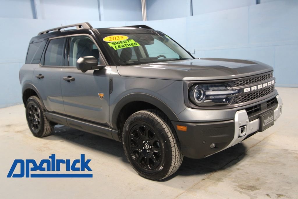 2025 Ford Bronco Sport Badlands We want you to shop confidently for your next used car at The BIG Ford Store, D-Patrick Ford. We are located on Highway 41 and Walnut in Evansville, right next to the Lloyd Expressway. Buy this used vehicle 100% online or in-store. This pre-owned vehicle was put through an extensive inspection before hitting our lot. Because of this, we are able to offer a 3-month/3,000-mile comprehensive limited warranty. You also get our Love It or Return It 5-day, 300-mile Exchange Policy. See our website for more details on both. We also offer extended service plans, vehicle protection plans, and offer a CarFax vehicle history report. *Prices listed do not include a $250 documentation fee, applicable tax, title, tags, license, or $195 service and preparation. All pricing, vehicle information, and features (such as accessories and color) are believed to be accurate, but we do not warrant or guarantee such accuracy. The prices shown above may vary from region to region, and incentives are subject to change. Some offers listed may not be available to all customers. All online sale commitments are subject to confirmation of continued availability of vehicle. Once availability is confirmed, online sale agreement becomes binding upon the parties. If any information found on the website is thought to be erroneous, please verify information with a customer service representative. See dealer for full details. Looking to sell your current vehicle? We buy cars for cash. Every test drive at D-Patrick Ford in Evansville earns $10 to a local charity. Schedule your test drive today! 4-Wheel Disc Brakes, 6 Speakers, ABS brakes, Air Conditioning, Alloy wheels, AM/FM radio: SiriusXM, AM/FM Stereo, Auto High-beam Headlights, Auto-dimming Rear-View mirror, Automatic temperature control, Brake assist, Compass, Delay-off headlights, Driver door bin, Driver vanity mirror, Dual front impact airbags, Dual front side impact airbags, Electronic Stability Control, Emergency communication system: SYNC 4 911 Assist, Equipment Group 400A, Four wheel independent suspension, Front anti-roll bar, Front Bucket Seats, Front Center Armrest, Front fog lights, Front License Plate Bracket, Front reading lights, Fully automatic headlights, Garage door transmitter, Heated door mirrors, Heated front seats, Heated steering wheel, Illuminated entry, Knee airbag, Leather Trimmed Front Bucket Seats, Low tire pressure warning, Memory seat, Occupant sensing airbag, Outside temperature display, Overhead airbag, Overhead console, Panic alarm, Passenger door bin, Passenger vanity mirror, Power door mirrors, Power driver seat, Power passenger seat, Power steering, Power windows, Radio data system, Rear anti-roll bar, Rear reading lights, Rear seat center armrest, Rear window defroster, Rear window wiper, Remote keyless entry, Security system, SiriusXM, Speed control, Speed-sensing steering, Speed-Sensitive Wipers, Split folding rear seat, Steering wheel mounted audio controls, SYNC 4 w/Enhanced Voice Recognition, Tachometer, Telescoping steering wheel, Tilt steering wheel, Traction control, Trip computer, Variably intermittent wipers, Wheels: 17 Matte Black-Painted Aluminum. CARFAX One-Owner. Clean CARFAX. 4D Sport Utility Badlands 8-Speed Automatic EcoBoost 2.0L I4 GTDi DOHC Turbocharged VCT 4WD Gray Metallic CALL TODAY (812) 625-4823 OR SHOP ONLINE AT WWW.DPATRICKFORD.COM.