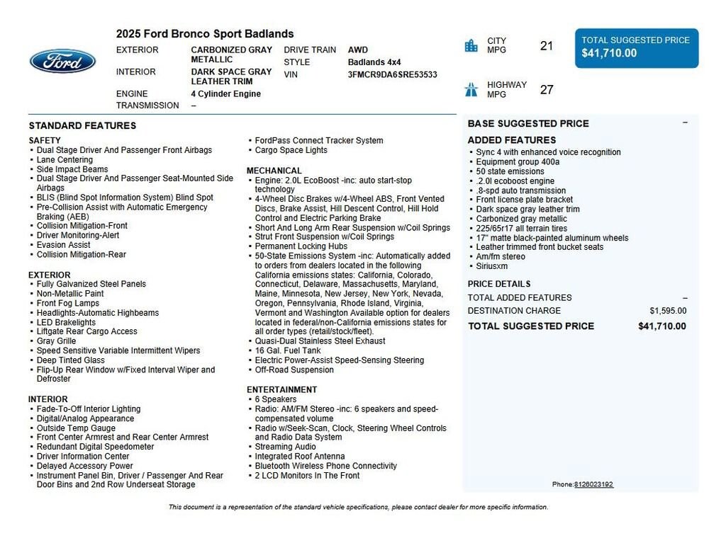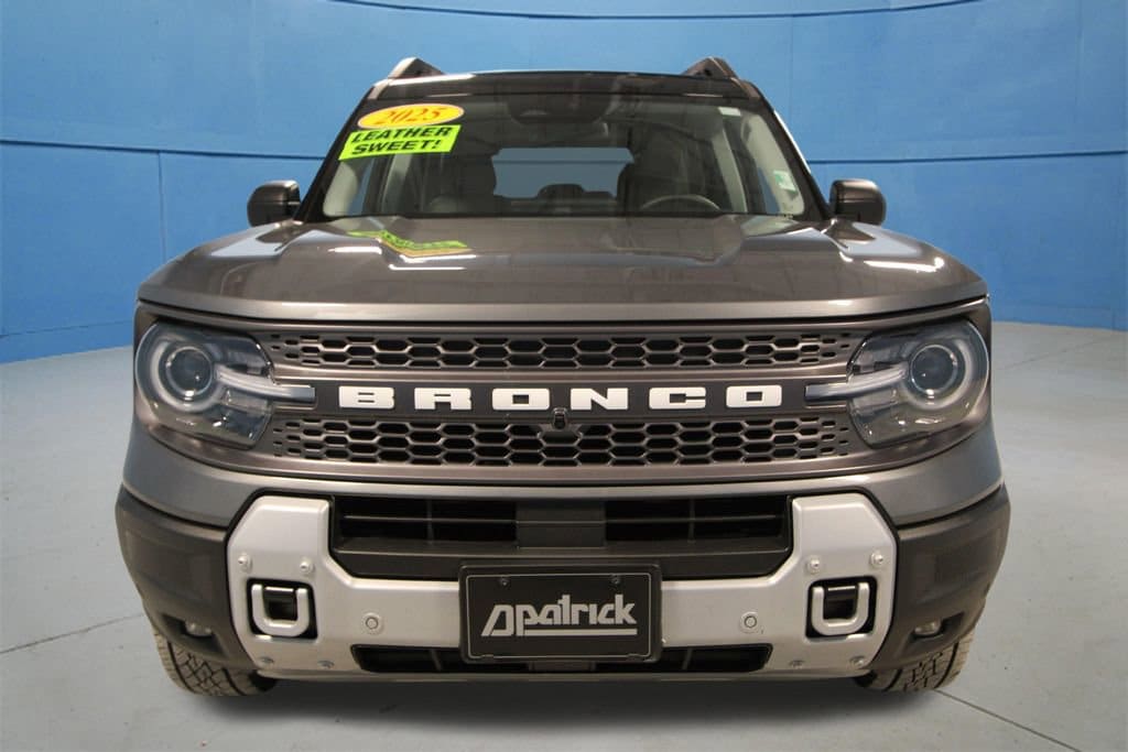 2025 Ford Bronco Sport Badlands Recent Arrival! We want you to shop confidently for your next used car at D-Patrick Lebanon Ford and We make it EASY! Buy this used vehicle 100% online or in-store, EASY. Saving time at the dealership, EASY! Financing, EASY! Finding the car you love at the price you want, EASY! This pre-owned vehicle was put through an extensive inspection before hitting our lot. Because of this, we are able to offer a 3-month/3,000-mile comprehensive limited warranty. You also get our Love It or Return It 5-day, 300-mile Exchange Policy. See our website for more details on both. We also offer extended service plans, vehicle protection plans, and CarFax vehicle history report. *Prices listed do not include a $250 documentation fee, applicable tax, title, tags, license, or $195 service and preparation. All pricing, vehicle information, and features (such as accessories and color) are believed to be accurate, but we do not warrant or guarantee such accuracy. The prices shown above may vary from region to region, and incentives are subject to change. Some offers listed may not be available to all customers. All online sale commitments are subject to confirmation of continued availability of vehicle. Once availability is confirmed, online sale agreement becomes binding upon the parties. If any information found on the website is thought to be erroneous, please verify information with a customer service representative. See dealer for full details. Looking to sell your current vehicle? We buy cars for cash. 4-Wheel Disc Brakes, 6 Speakers, ABS brakes, Air Conditioning, Alloy wheels, AM/FM radio: SiriusXM, AM/FM Stereo, Auto High-beam Headlights, Auto-dimming Rear-View mirror, Automatic temperature control, Brake assist, Compass, Delay-off headlights, Driver door bin, Driver vanity mirror, Dual front impact airbags, Dual front side impact airbags, Electronic Stability Control, Emergency communication system: SYNC 4 911 Assist, Equipment Group 400A, Four wheel independent suspension, Front anti-roll bar, Front Bucket Seats, Front Center Armrest, Front fog lights, Front License Plate Bracket, Front reading lights, Fully automatic headlights, Garage door transmitter, Heated door mirrors, Heated front seats, Heated steering wheel, Illuminated entry, Knee airbag, Leather Trimmed Front Bucket Seats, Low tire pressure warning, Memory seat, Occupant sensing airbag, Outside temperature display, Overhead airbag, Overhead console, Panic alarm, Passenger door bin, Passenger vanity mirror, Power door mirrors, Power driver seat, Power passenger seat, Power steering, Power windows, Radio data system, Rear anti-roll bar, Rear reading lights, Rear seat center armrest, Rear window defroster, Rear window wiper, Remote keyless entry, Security system, SiriusXM, Speed control, Speed-sensing steering, Speed-Sensitive Wipers, Split folding rear seat, Steering wheel mounted audio controls, SYNC 4 w/Enhanced Voice Recognition, Tachometer, Telescoping steering wheel, Tilt steering wheel, Traction control, Trip computer, Variably intermittent wipers, Wheels: 17" Matte Black-Painted Aluminum. CARFAX One-Owner. Clean CARFAX. 4D Sport Utility Badlands 8-Speed Automatic EcoBoost 2.0L I4 GTDi DOHC Turbocharged VCT 4WD Gray Metallic CALL US TODAY BEFORE THIS ONE GETS AWAY-- (765) 204-6248 or shop online at www.dpatricklebanonford.com.