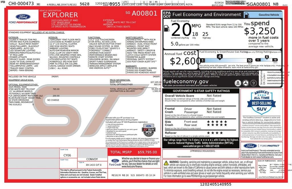 2025 Ford Explorer ST Recent Arrival! We want you to shop confidently for your next used car at D-Patrick Lebanon Ford and We make it EASY! Buy this used vehicle 100% online or in-store, EASY. Saving time at the dealership, EASY! Financing, EASY! Finding the car you love at the price you want, EASY! This pre-owned vehicle was put through an extensive inspection before hitting our lot. Because of this, we are able to offer a 3-month/3,000-mile comprehensive limited warranty. You also get our Love It or Return It 5-day, 300-mile Exchange Policy. See our website for more details on both. We also offer extended service plans, vehicle protection plans, and CarFax vehicle history report. *Prices listed do not include a $250 documentation fee, applicable tax, title, tags, license, or $195 service and preparation. All pricing, vehicle information, and features (such as accessories and color) are believed to be accurate, but we do not warrant or guarantee such accuracy. The prices shown above may vary from region to region, and incentives are subject to change. Some offers listed may not be available to all customers. All online sale commitments are subject to confirmation of continued availability of vehicle. Once availability is confirmed, online sale agreement becomes binding upon the parties. If any information found on the website is thought to be erroneous, please verify information with a customer service representative. See dealer for full details. Looking to sell your current vehicle? We buy cars for cash. 4WD, 10 Speakers, 3.58 Non-Limited Slip Rear Axle, 3rd row seats: bench, 4-Wheel Disc Brakes, ABS brakes, Air Conditioning, Alloy wheels, AM/FM radio: SiriusXM with 360L, Apple CarPlay/Android Auto, Auto High-beam Headlights, Auto-dimming door mirrors, Auto-dimming Rear-View mirror, Automatic temperature control, Brake assist, Bumpers: body-color, Compass, Delay-off headlights, Driver door bin, Driver vanity mirror, Dual front impact airbags, Dual front side impact airbags, Electronic Stability Control, Emergency communication system: 911 Assist, Equipment Group 400A Standard Package, Exterior Parking Camera Rear, Four wheel independent suspension, Front & 2nd Rows Floor Liners w/Carpet Floor Mats, Front anti-roll bar, Front Bucket Seats, Front Center Armrest, Front dual zone A/C, Front fog lights, Front reading lights, Fully automatic headlights, Garage door transmitter, Heated door mirrors, Heated front seats, Heated rear seats, Heated steering wheel, Heated/Ventilated Miko Sport Captain's Chairs, Illuminated entry, Internet access capable: FordPass Connect 5G, Knee airbag, Leather steering wheel, Low tire pressure warning, Memory seat, Navigation System, Occupant sensing airbag, Outside temperature display, Overhead airbag, Overhead console, Panic alarm, Passenger door bin, Passenger vanity mirror, Power door mirrors, Power driver seat, Power Liftgate, Power passenger seat, Power steering, Power windows, Radio: B&O Sound System by Bang & Olufsen, Rain sensing wipers, Rear air conditioning, Rear anti-roll bar, Rear reading lights, Rear window defroster, Rear window wiper, Remote keyless entry, Security system, Speed control, Speed-sensing steering, Speed-Sensitive Wipers, Split folding rear seat, Spoiler, Sport steering wheel, Steering wheel mounted audio controls, Tachometer, Telescoping steering wheel, Tilt steering wheel, Traction control, Trip computer, Turn signal indicator mirrors, Variably intermittent wipers, Ventilated front seats, Wheels: 21" Magnetite-Painted Aluminum, 4WD. CARFAX One-Owner. 4D Sport Utility ST 10-Speed Automatic 3.0L EcoBoost V6 4WD White Metallic CALL US TODAY BEFORE THIS ONE GETS AWAY-- (765) 204-6248 or shop online at www.dpatricklebanonford.com.