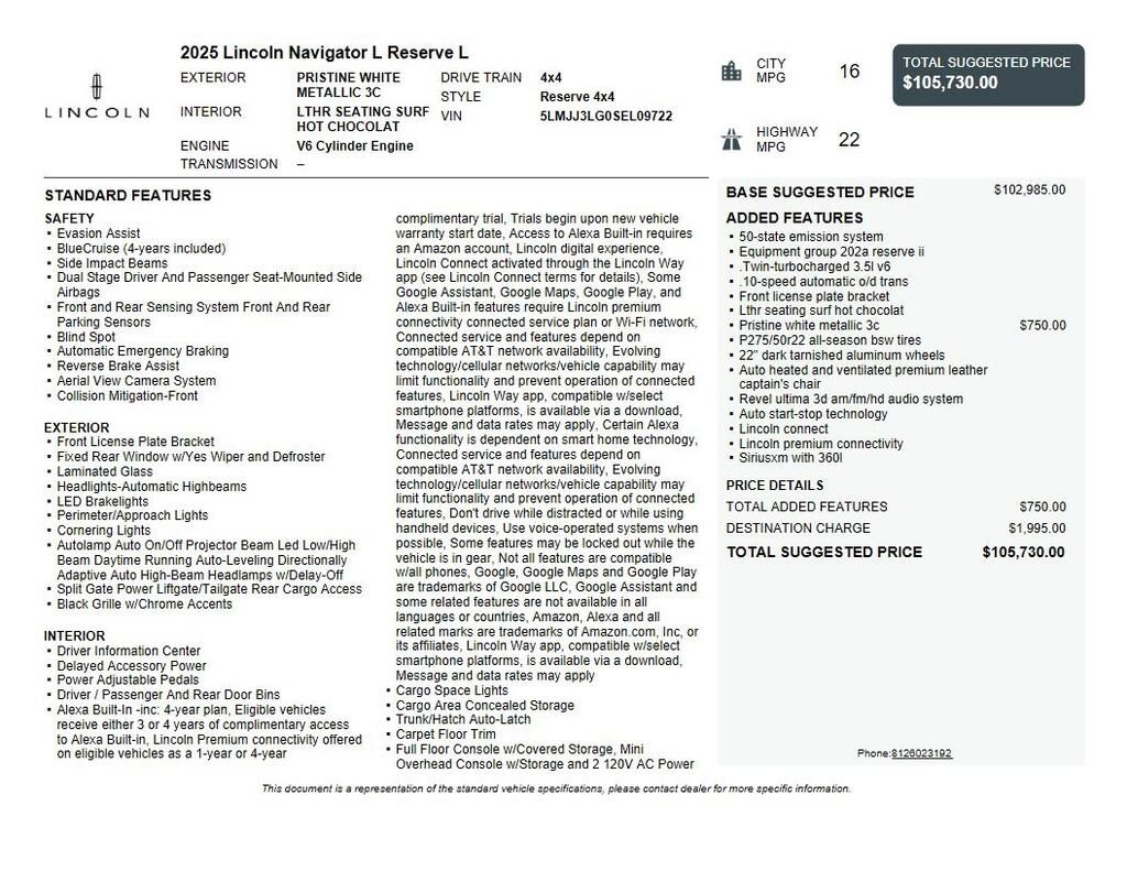 2025 Lincoln Navigator L Reserve We want you to shop confidently for your next used car at The BIG Ford Store, D-Patrick Ford. We are located on Highway 41 and Walnut in Evansville, right next to the Lloyd Expressway. Buy this used vehicle 100% online or in-store. This pre-owned vehicle was put through an extensive inspection before hitting our lot. Because of this, we are able to offer a 3-month/3,000-mile comprehensive limited warranty. You also get our Love It or Return It 5-day, 300-mile Exchange Policy. See our website for more details on both. We also offer extended service plans, vehicle protection plans, and offer a CarFax vehicle history report. *Prices listed do not include a $250 documentation fee, applicable tax, title, tags, license, or $195 service and preparation. All pricing, vehicle information, and features (such as accessories and color) are believed to be accurate, but we do not warrant or guarantee such accuracy. The prices shown above may vary from region to region, and incentives are subject to change. Some offers listed may not be available to all customers. All online sale commitments are subject to confirmation of continued availability of vehicle. Once availability is confirmed, online sale agreement becomes binding upon the parties. If any information found on the website is thought to be erroneous, please verify information with a customer service representative. See dealer for full details. Looking to sell your current vehicle? We buy cars for cash. Every test drive at D-Patrick Ford in Evansville earns $10 to a local charity. Schedule your test drive today! 28 Speakers, 3rd row seats: split-bench, 4-Wheel Disc Brakes, ABS brakes, Adaptive suspension, Adjustable pedals, Air Conditioning, Alloy wheels, AM/FM radio: SiriusXM with 360L, Apple CarPlay/Android Auto, Audio memory, Auto High-beam Headlights, Auto Htd & Ventilated Premium Lthr Captain's Chair, Auto Start-Stop Technology, Auto tilt-away steering wheel, Auto-dimming door mirrors, Auto-dimming Rear-View mirror, Auto-leveling suspension, Automatic temperature control, Brake assist, Bumpers: body-color, Compass, Delay-off headlights, Driver door bin, Driver vanity mirror, Driver's Seat Mounted Armrest, Dual front impact airbags, Dual front side impact airbags, Electronic Stability Control, Emergency communication system: 911 Assist, Equipment Group 202A Reserve II, Exterior Parking Camera Rear, Four wheel independent suspension, Front anti-roll bar, Front Bucket Seats, Front dual zone A/C, Front License Plate Bracket, Front reading lights, Fully automatic headlights, Garage door transmitter, Heated door mirrors, Heated front seats, Heated rear seats, Heated steering wheel, HVAC memory, Illuminated entry, Leather steering wheel, Lincoln Connect, Lincoln Premium Connectivity, Low tire pressure warning, Memory seat, Navigation system: Connected Navigation (1-year trial), Occupant sensing airbag, Outside temperature display, Overhead airbag, Overhead console, Panic alarm, Passenger door bin, Passenger seat mounted armrest, Passenger vanity mirror, Pedal memory, Power adjustable front head restraints, Power adjustable rear head restraints, Power door mirrors, Power driver seat, Power moonroof, Power passenger seat, Power steering, Power windows, Radio data system, Radio: Revel Ultima 3D AM/FM/HD Audio System, Rain sensing wipers, Rear air conditioning, Rear anti-roll bar, Rear audio controls, Rear reading lights, Rear window defroster, Rear window wiper, Reclining 3rd row seat, Remote keyless entry, Security system, SiriusXM w/360L, Speed control, Speed-sensing steering, Speed-Sensitive Wipers, Split folding rear seat, Spoiler, Steering wheel memory, Steering wheel mounted audio controls, Tachometer, Telescoping steering wheel, Tilt steering wheel, Traction control, Trip computer, Turn signal indicator mirrors, Variably intermittent wipers, Ventilated front seats, Wheels: 22 Dark Tarnished Aluminum. CARFAX One-Owner. 4D Sport Utility Reserve 10-Sp