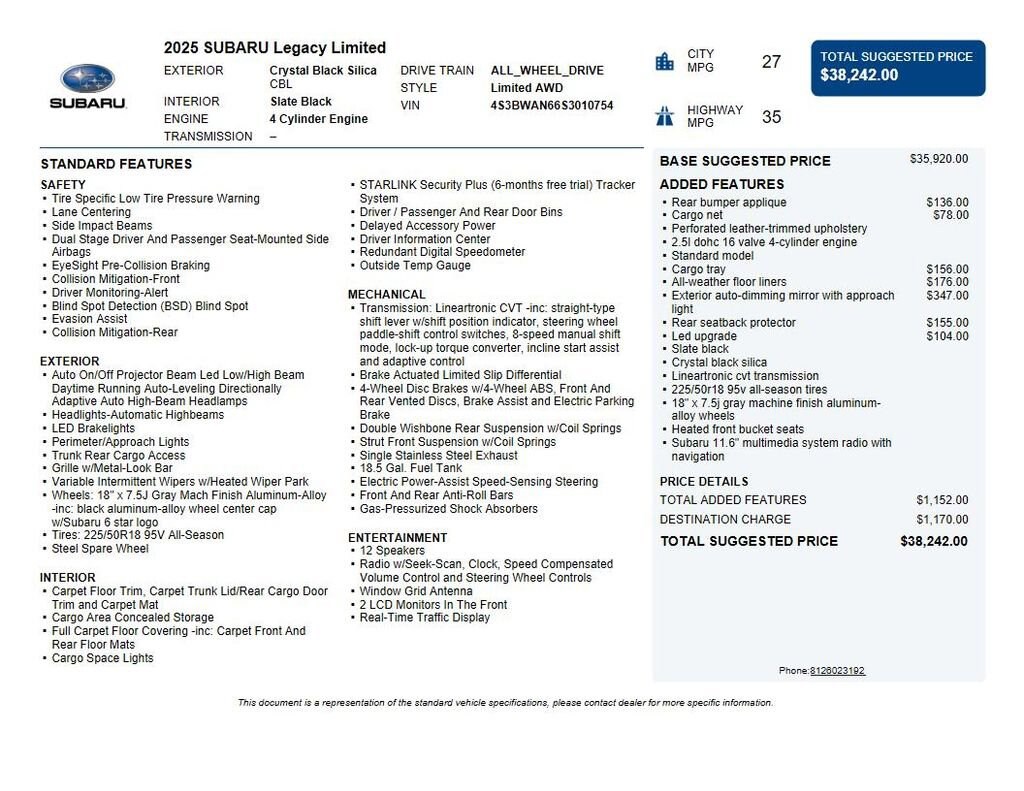 2025 Subaru Legacy Limited We want you to shop confidently for your next used car at The BIG Ford Store, D-Patrick Ford. We are located on Highway 41 and Walnut in Evansville, right next to the Lloyd Expressway. Buy this used vehicle 100% online or in-store. This pre-owned vehicle was put through an extensive inspection before hitting our lot. Because of this, we are able to offer a 3-month/3,000-mile comprehensive limited warranty. You also get our Love It or Return It 5-day, 300-mile Exchange Policy. See our website for more details on both. We also offer extended service plans, vehicle protection plans, and offer a CarFax vehicle history report. *Prices listed do not include a $250 documentation fee, applicable tax, title, tags, license, or $195 service and preparation. All pricing, vehicle information, and features (such as accessories and color) are believed to be accurate, but we do not warrant or guarantee such accuracy. The prices shown above may vary from region to region, and incentives are subject to change. Some offers listed may not be available to all customers. All online sale commitments are subject to confirmation of continued availability of vehicle. Once availability is confirmed, online sale agreement becomes binding upon the parties. If any information found on the website is thought to be erroneous, please verify information with a customer service representative. See dealer for full details. Looking to sell your current vehicle? We buy cars for cash. Every test drive at D-Patrick Ford in Evansville earns $10 to a local charity. Schedule your test drive today! 12 Speakers, 4-Wheel Disc Brakes, ABS brakes, Air Conditioning, All-Weather Floor Liners, Alloy wheels, AM/FM radio: SiriusXM with 360L, Anti-whiplash front head restraints, Apple CarPlay & Android Auto, Auto High-beam Headlights, Auto-dimming Rear-View mirror, Automatic temperature control, Brake assist, Bumpers: body-color, Cargo Net, Cargo Tray, Compass, Driver door bin, Driver vanity mirror, Dual front impact airbags, Dual front side impact airbags, Electronic Stability Control, Emergency communication system: MySubaru Safety Plus (3-year free trial included), Exterior Auto-Dimming Mirror w/Approach Light, Exterior Parking Camera Rear, Four wheel independent suspension, Front anti-roll bar, Front Bucket Seats, Front Center Armrest w/Storage, Front dual zone A/C, Front fog lights, Front reading lights, Fully automatic headlights, Garage door transmitter: HomeLink, harman/kardon® Speakers, Heated door mirrors, Heated Front Bucket Seats, Heated front seats, Heated rear seats, Heated steering wheel, HVAC memory, Illuminated entry, Knee airbag, Leather steering wheel, LED Upgrade, Low tire pressure warning, Memory seat, Navigation system: TomTom Navigation w/what3words, Occupant sensing airbag, Outside temperature display, Overhead airbag, Overhead console, Panic alarm, Passenger door bin, Passenger vanity mirror, Perforated Leather-Trimmed Upholstery, Power door mirrors, Power driver seat, Power moonroof, Power passenger seat, Power steering, Power windows, Radio: Subaru 11.6 Multimedia System w/Navigation, Rear anti-roll bar, Rear Bumper Applique, Rear seat center armrest, Rear Seatback Protector, Rear window defroster, Remote keyless entry, Security system, Speed control, Speed-sensing steering, Split folding rear seat, Standard Model, Steering wheel mounted audio controls, Tachometer, Telescoping steering wheel, Tilt steering wheel, Traction control, Trip computer, Turn signal indicator mirrors, Variably intermittent wipers, Wheels: 18 x 7.5J Gray Mach Finish Aluminum-Alloy. CARFAX One-Owner. Clean CARFAX. 4D Sedan Limited Lineartronic CVT 2.5L 4-Cylinder DOHC 16V AWD Crystal Black Silica CALL TODAY (812) 625-4823 OR SHOP ONLINE AT WWW.DPATRICKFORD.COM.